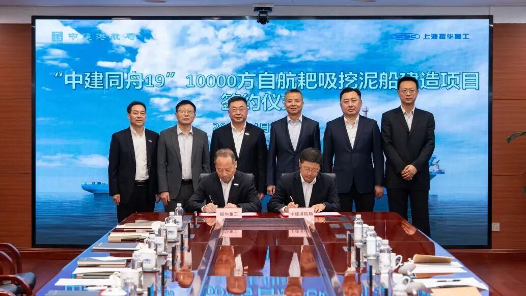 4月25日,上海振华重工集团与中建港航局集团举行“中建同舟19”10000方自航耙吸挖泥船签约仪式。该船由中船七〇八研究所设计,智能化程度高,能够适应多种复杂海况作业环境,建成后将进一步助力提升我国疏浚能力与水平,为海洋强国建设贡献力量。