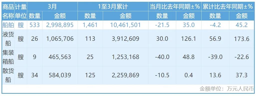 近日,海关总署发布我国今年3月进出口商品最新统计月报。统计数据显示,今年3月,我国船舶出口533艘、金额达299.8895亿元,在数量同比下降21.5%的情况下,金额同比增长35.0%。