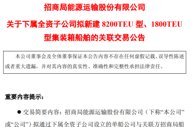 4月25日,招商局能源运输股份有限公司发布交易公告,通过下属全资子公司设立的单船公司与关联方招商局船舶工业集团有限公司下属公司签署《船舶订造协议》,拟新造4艘8200TEU型甲醇预留集装箱船和4艘1800TEU型集装箱船,项目总投资预计不超过38.14亿元,交船期为2028年。