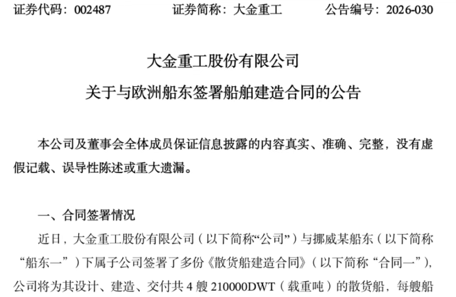 4月23日,大金重工股份有限公司发布公告称,该公司与挪威某船东和希腊某船东分别签署4艘散货船建造合同,8艘船合计价值约6亿美金。