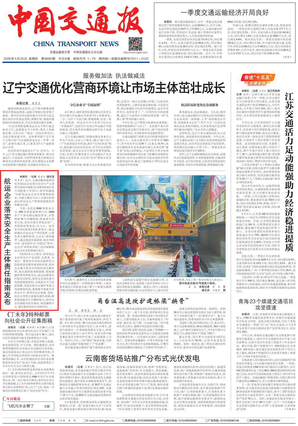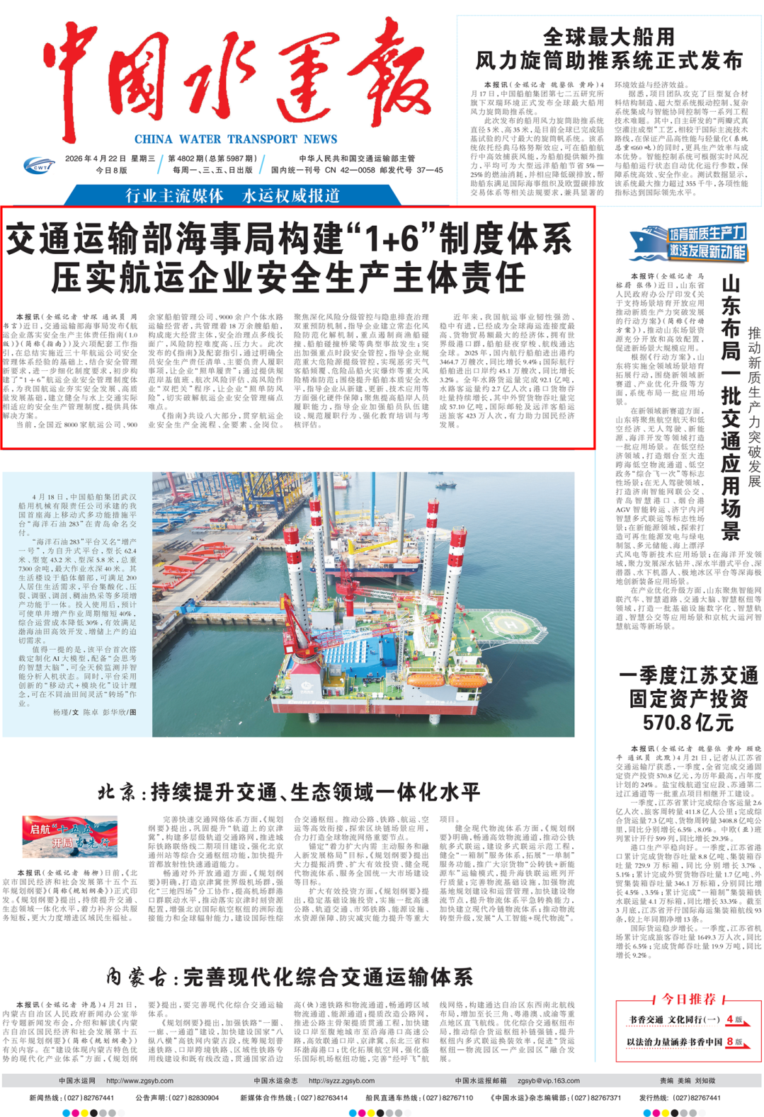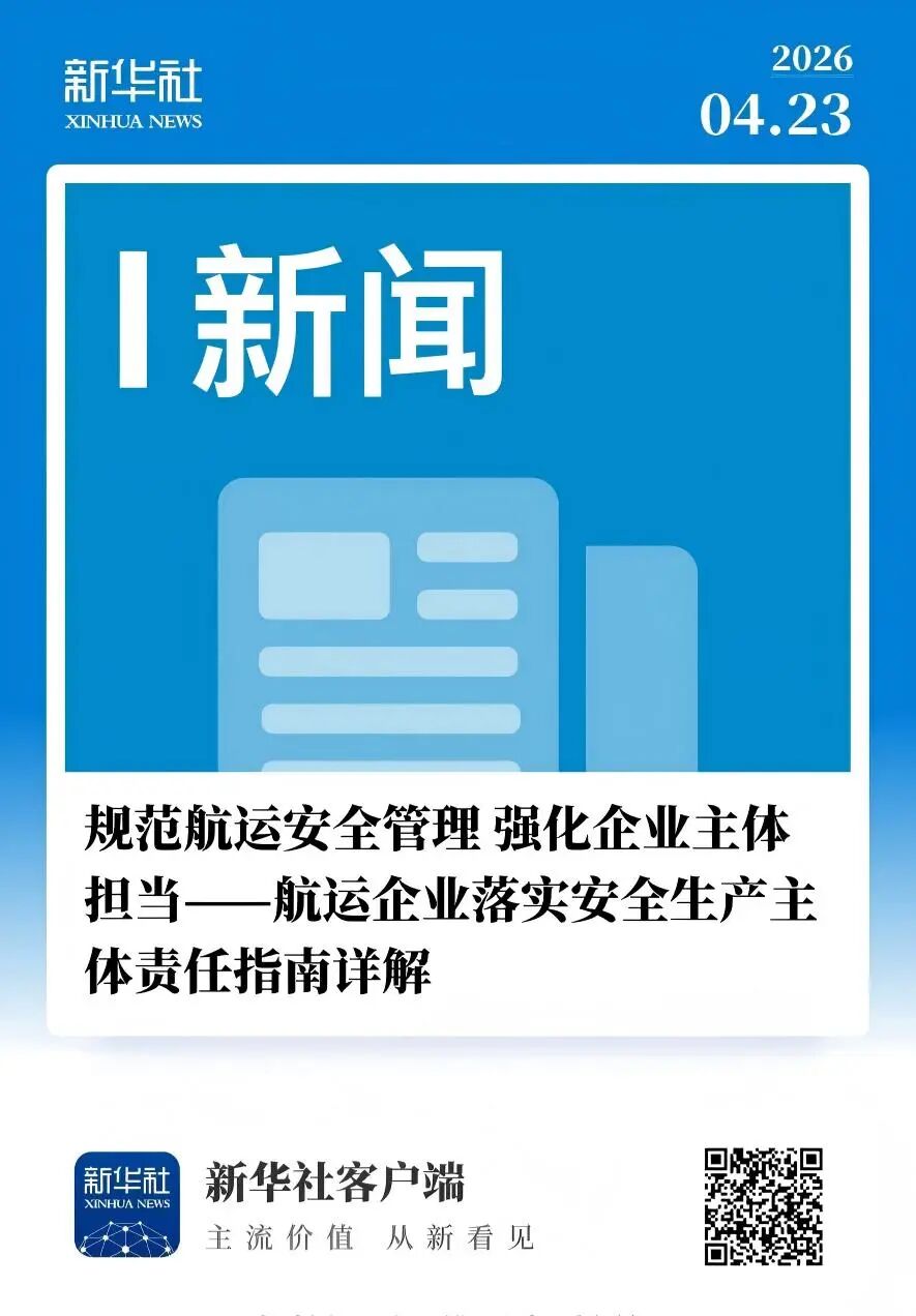 交通运输部海事局近日发布《航运企业落实安全生产主体责任指南(1.0版)》及6项配套工作指引,初步构建起“1+6”航运企业安全管理制度体系,为我国航运业夯实安全发展基础。(人民日报4版、新华社、中国交通报头版、中国水运报头版)