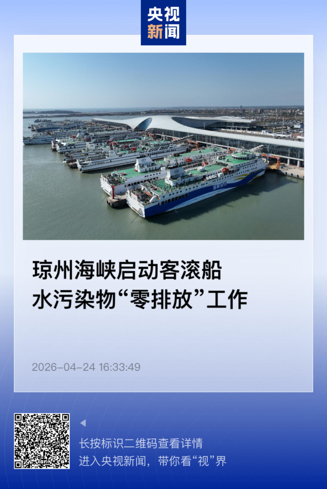 4月24日,记者从湛江海事局了解到,琼州海峡客滚船水污染物“零排放”工作试点在北岸正式启动。首艘参与试点的客滚船“凤凰岭”轮顺利完成生活污水岸上接收,标志着琼州海峡客滚船水污染物治理迈入“零排放”新阶段。(央视新闻客户端)