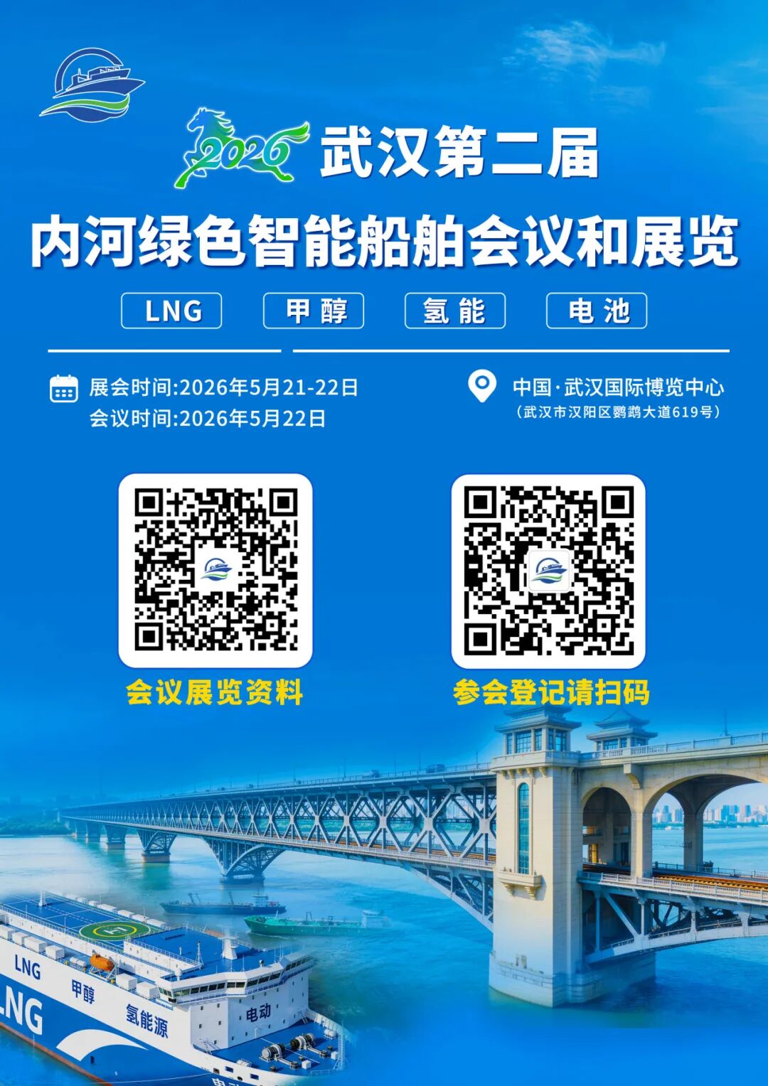 内河航运是综合运输体系和水资源综合利用的重要组成部分 。在全国推进“双碳”的背景下,加快内河船舶绿色智能发展是建设交通强国、航运实现高质量发展的一项重要任务。为此,国家发布了一系列文件大力推进和支持内河船舶的绿色智能发展。在“ 十二五 ”和“ 十三五 ”期间国家多次发布文件要求和支持船舶使用LNG等清洁能源,并做出具体部署;进入“ 十四五 ”后,国家对航运业高质量发展和绿色转型提出新要求,出台新政策、做出新部署,推进船舶绿色智能发展的进程,并 将 其 列 入 国 家 推动大规模设备更新的战略部署,给予多方面政策支持,近日发布的国家“ 十五五 ”发展规划,强调要以绿色+智能双轮驱动,加快推动全面绿色转型。为内河航运加快绿色转型带来难得的新机遇。中国交通运输协会经研究,决定遵循“ 双向服务 ”的宗旨,抓住机遇,于2025年11月在芜湖成功举办“ 2025首届内河船舶绿色智能发展论坛 ”的基础上,由中国交通运输协会、中国港口协会等单位共同主办协办的《2026第二届内河绿色智能船舶会议和展 览》将于2026年5月21—22日在武汉国际博览中心举办,为此特制定本实施方案 。了解国家政策和行业发展动态,把握内河船舶最前沿的技术和设备,诚邀业内人士参加会议交流、讨论,为内河船舶绿色智能发展贡献智慧和力量。