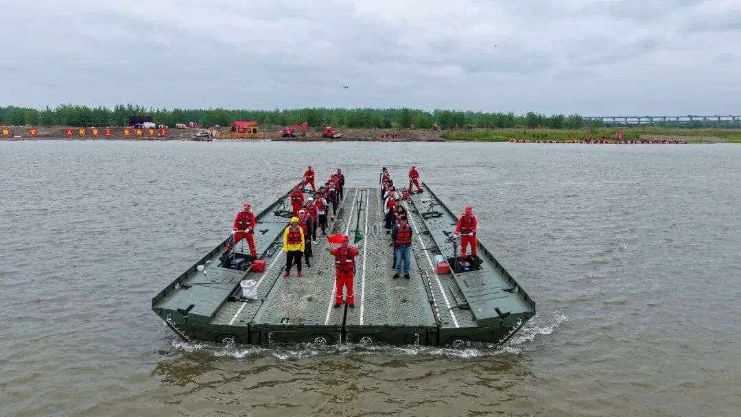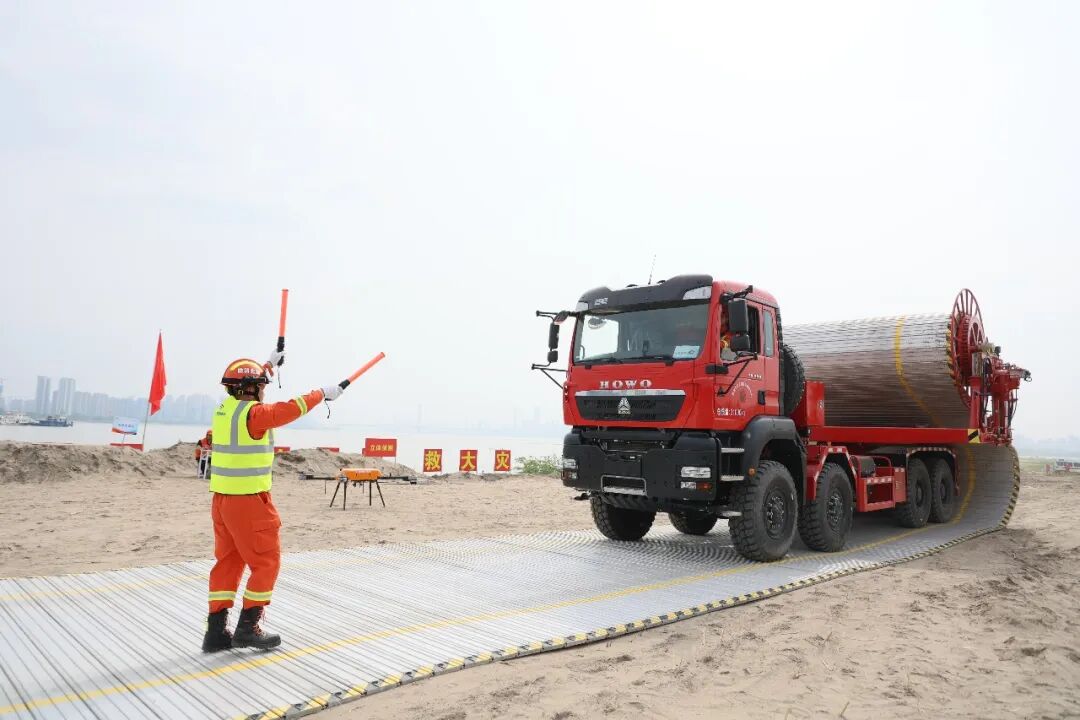 中船集团中船应急的多型装备在演练中表现亮眼:硬质机动路面车率先作业,于泥泞破损路段快速铺设百米应急通行通道,高效打通救援关键路线,保障大型抢险装备顺利进场,优先抢通生命通道;人工携行越障器材高效便捷,在5分钟内可完成20米应急桥梁的搭建,助力救援人员快速通过激流水域,快速抵达受灾区域;此外动力舟桥、直升机停机坪及75米应急模块化桥等多类装备同步投入实操演练,全方位展现了企业在综合应急抢险、多场景救援领域的系统化装备实力与硬核技术优势。