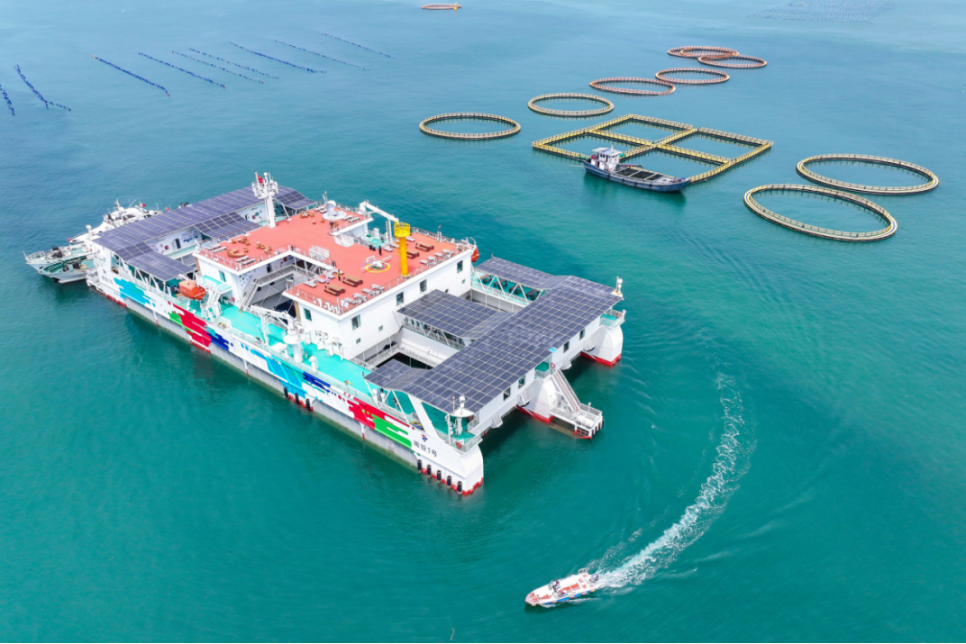 福建坚持把深远海养殖装备作为业态融合创新的重要载体,加快发展负碳排放深远海渔场,探索渔光互补、风渔互补等多业态融合,推进建设零碳智慧新能源岛屿,打造深远海养殖保障补给基地,实现“海能海用”、就地消纳。“闽投1号”通过搭建深远海产业创新平台,深化与高校、科研院所、行业机构产学研合作,聚焦深远海养殖技术研发、优质种苗培育、生态养殖模式创新、养殖装备升级、海洋资源综合利用的关键领域,开展技术攻关与试验示范。同时,还搭载光伏发电和储能模块,推动养殖生产能源清洁化、废弃物资源化利用,打造零碳绿色养殖样板,建设零碳绿色养殖产业园。