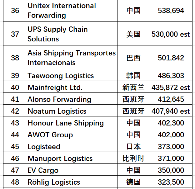 - 汇利达国际货运(香港)有限公司(Unitex International Forwarding)排名第36位,货量53.9万TEU;