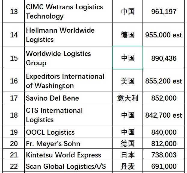 - 环世物流(Worldwide Logistics Group)排名第15位,货量89.0万TEU;