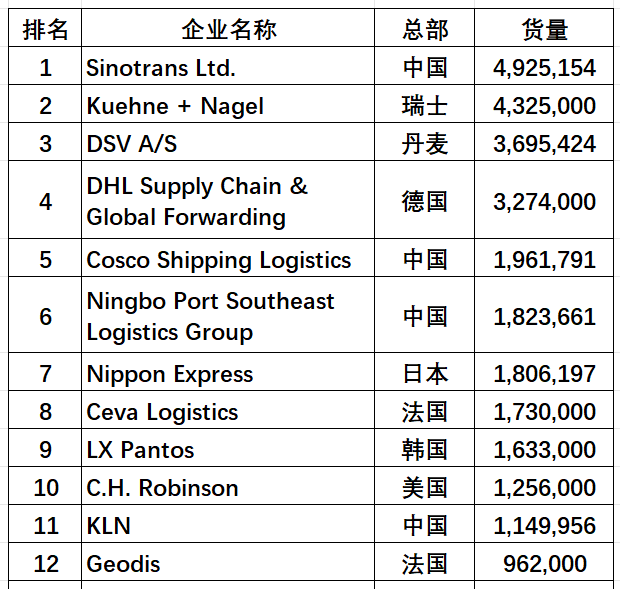 - 罗宾升(C.H. Robinson Worldwide)排名第十,货量125.6万TEU。