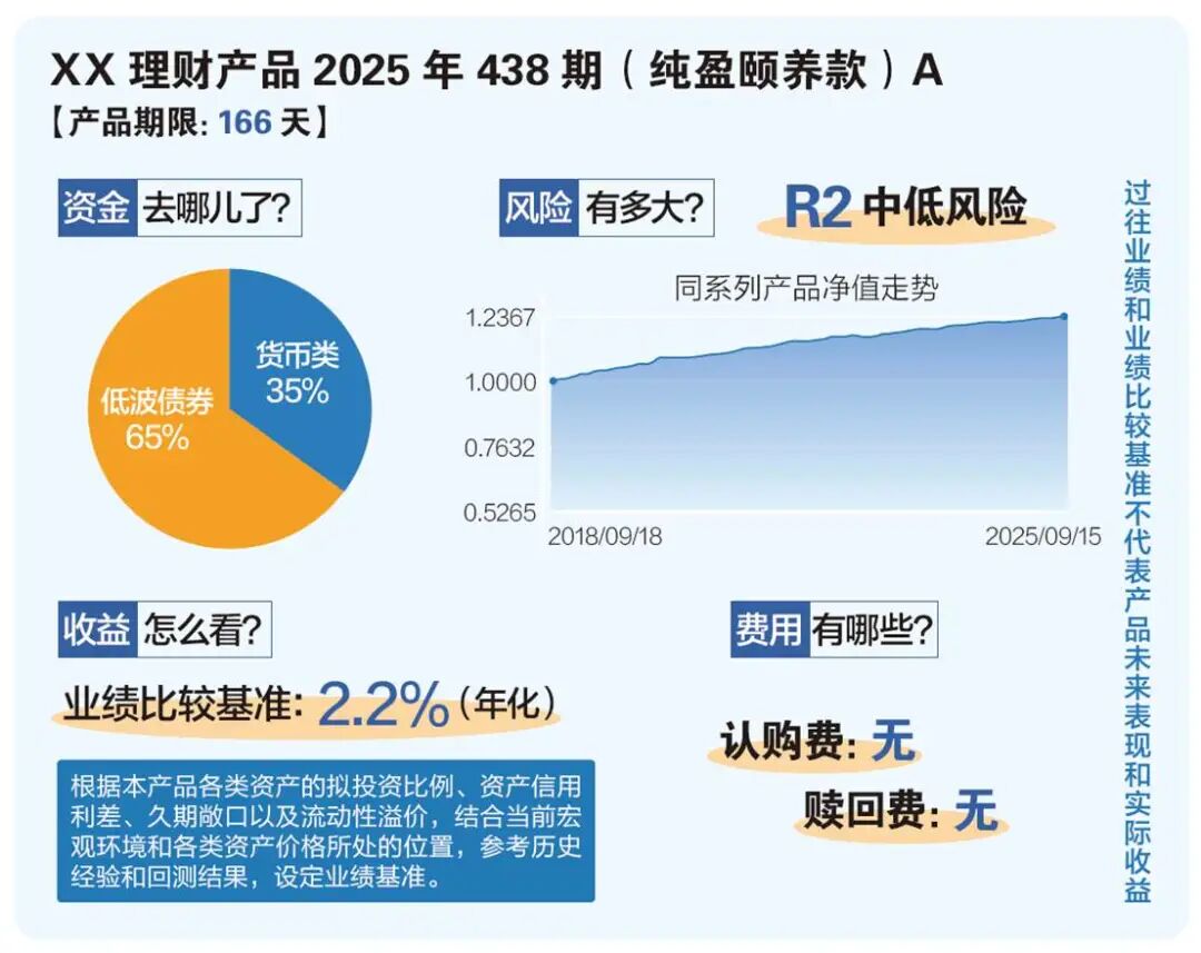 传统的理财销售方式存在诸多痛点,理财经理口头解释产品时随意性较大,容易规避风险提示或使用误导性话术;客户尤其是中老年客户,难以在短时间内理解复杂的合同条款和专业术语。这些问题的存在,不仅损害了客户的知情权和公平交易权,也为后续纠纷埋下了隐患。为此,兴业银行创新推出“理财明白卡”,详见下图所示,即针对每款理财产品,设计一页A4纸大小、包含清晰图表和通俗语言的可视化讲解工具,并配套标准化流程和监督机制,全面优化理财销售环节。“理财明白卡”具体包含以下四大核心要素,且需经过合规部门审核:1. 资金去哪了(资产配置图)。以饼图形式清晰展示投资于债券、非标、权益等资产的大致比例。2. 风险有多大(风险等级与波动示意图),明确标出产品风险等级(PR1-PR5),并用一条历史波动曲线或模拟波动区间图,直观展示本金可能面临的波动情况。3. 收益怎么看(业绩基准说明),突出“业绩比较基准不是预期收益率,更不是承诺”的提示,并简要说明基准的测算依据。4. 费用有哪些(费用明细表),列出所有涉及的费用类型、收取标准和计算方式,并举例说明费用对最终收益的影响。“理财明白卡”将复杂的金融产品转化为客户能看懂的通用语言,实现了信息的标准化和平等化;通过工具和流程强制介入,规范了销售人员的行为,确保了关键信息的有效传递。