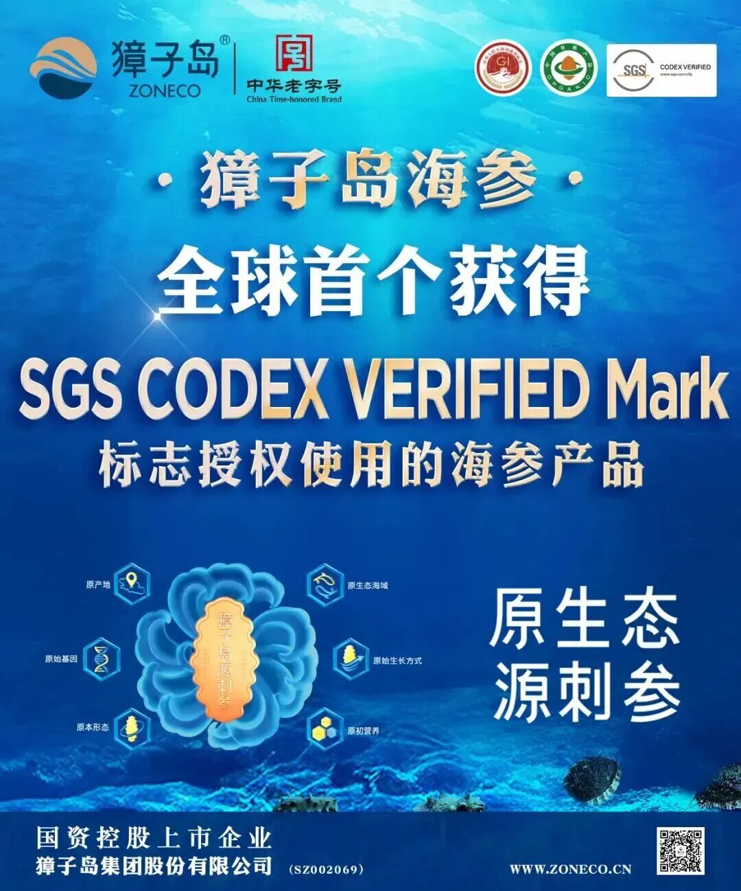 獐子岛海参由国际检验机构SGS进行供应链全程监控,通过了188项药残检测,成为全球首个获得SGS CODEX VERIFIED Mark标志授权使用的海参产品。同时,还获得了国家地理标志保护产品、有机产品和大连海参原产地认证。