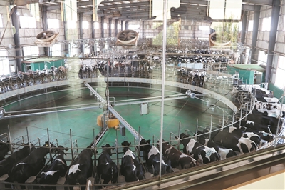 博宇牧业智慧奶厅里,80位转盘式挤奶机每小时能完成500头奶牛的挤奶任务。