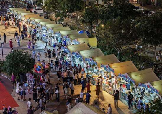 9月16日,近期,浙江省诸暨市陶朱街道办事处依托“浙江省城市篮球联赛”这一群众篮球赛事,在诸暨市篮球中心旁举办“陶你所需·朱市云集”共富市集(无人机照片)。新华社记者 徐昱 摄