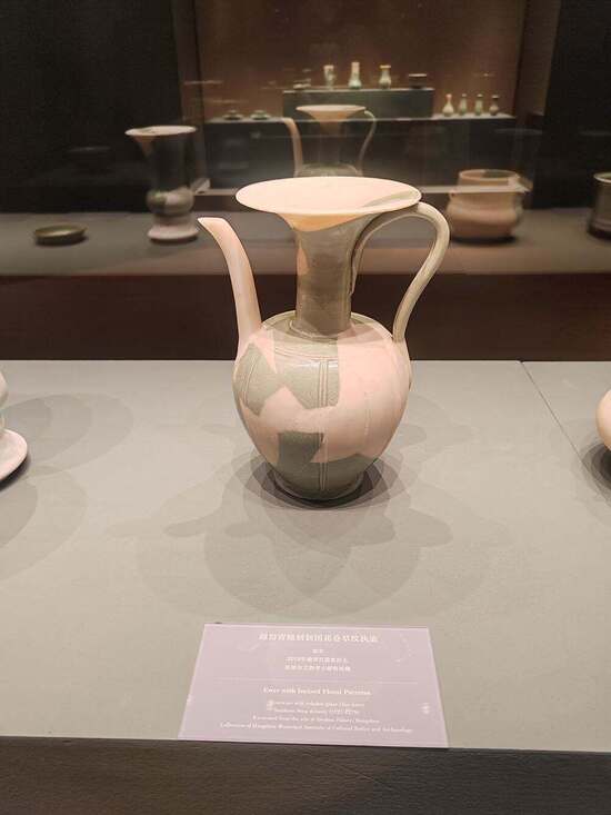 展出的南宋花器中,约四分之一来自德寿宫遗址。德寿宫是当时南宋太上皇帝居住的宫殿。胡利红介绍说,越窑青瓷在宋代逐渐衰落,但是遗址中出土的一件越窑执壶异常精美,堪称“越窑绝唱”。为了让观众更好地领略器物的原真之美,修复师未对补足的白胎上色,避免喧宾夺主,“文物修复有‘先不修、再修’的原则,以最大程度地保留文物的信息”。