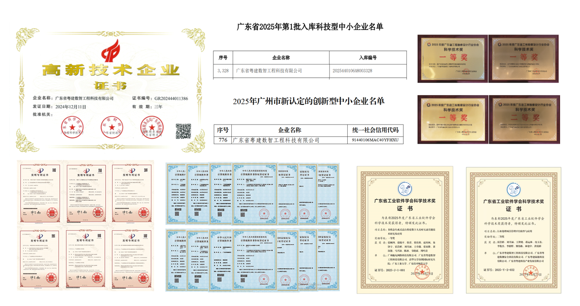 三年来,粤建数智始终以技术创新为核心驱动力,稳扎稳打走出一条高质量发展道路,先后获评“科技型中小企业”“高新技术企业”“创新型中小企业”,累计取得7项发明专利、39项软件著作权,荣获4项广东省工程勘察设计行业协会科学技术奖、2项广东省工业软件学会科学技术奖,自主创新能力持续增强。