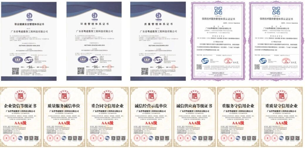 粤建数智秉持“咨询推动市场、软件追求品质、服务创造价值”的经营理念,先后通过ISO 9001质量管理体系认证、ISO 14001环境管理体系认证、ISO 45001职业健康安全管理体系认证、ISO20000信息技术服务管理体系和ISO27001信息安全管理体系等多项国际管理体系认证,建立起标准化、规范化的运营体系,客户满意度持续保持高位,获评“AAA级信用企业”认证,以精细化服务赢得市场口碑。
