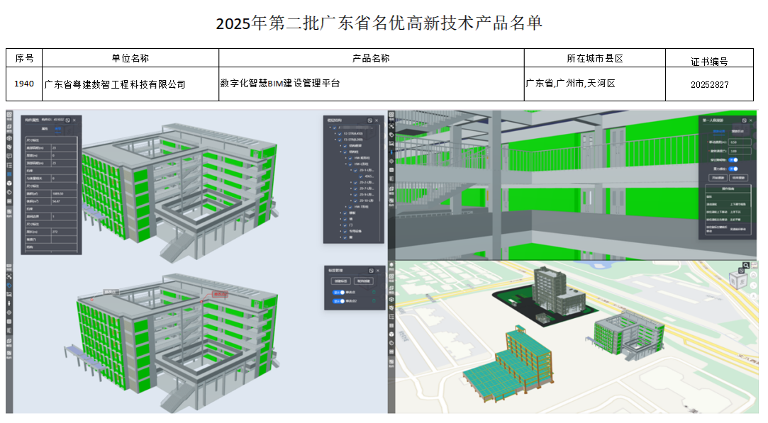 立足工程建设数字化转型痛点,粤建数智研发出多项具有独特竞争优势的核心产品与解决方案。自主研发的数字化智慧BIM建设管理平台成功入选2025年第二批广东省名优高新技术产品名单。相关产品与方案不仅精准匹配客户个性化需求,有效补全工程项目信息不对称短板,更在BIM国产化自主可控、智慧工地标准等细分领域填补空白,为行业数字化转型提供可复制、可推广的实践路径。目前,相关成果已在多个重点工程项目中落地应用,获得行业主管部门及上下游企业的高度认可。