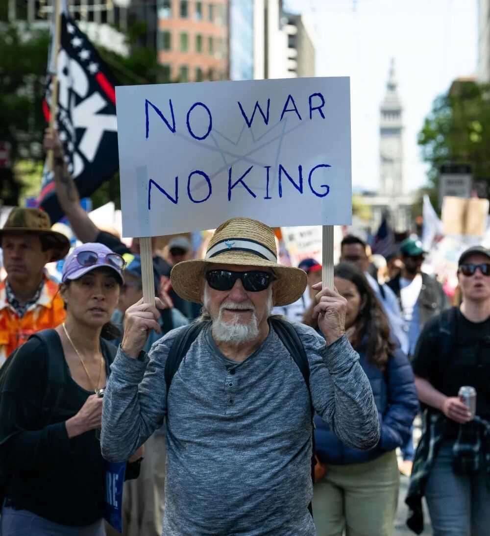 3月28日,人们在美国加利福尼亚州旧金山参加“不要国王”抗议活动。新华社发(朱子于摄)其次,枪支泛滥为不满情绪滑向极端暴力提供“催化剂”。此次事件的嫌疑人随身携带霰弹枪、手枪等枪械,再次表明美国枪械管控松弛的现状。