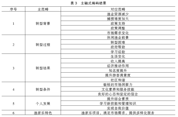 主轴式编码在开放式编码的基础上,对初始范畴进行比较、分析,进一步归纳主范畴的过程。本文通过对开放式编码进行提炼,最终得到转型背景、转型过程、转型结果、转型条件、个人发展、渔家乐特色共6个主轴式编码,如表3。