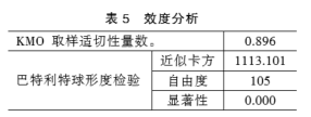 效度又称有效性,效度分析是指采用同样的方法对同一对象重复测量所得结果的一致性程度。本研究重点分析结构效度,对15个指标进行KMO和Bartlett球形度检验,KMO值为0.896,如表5,有效性良好;Bartlett球形度检验的近似卡方值为1113.101,自由度df值为105,显著性p值为0.000,小于0.005,表明此变量模型适用于因子分析。