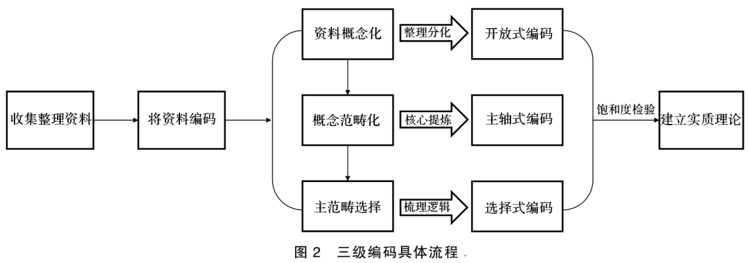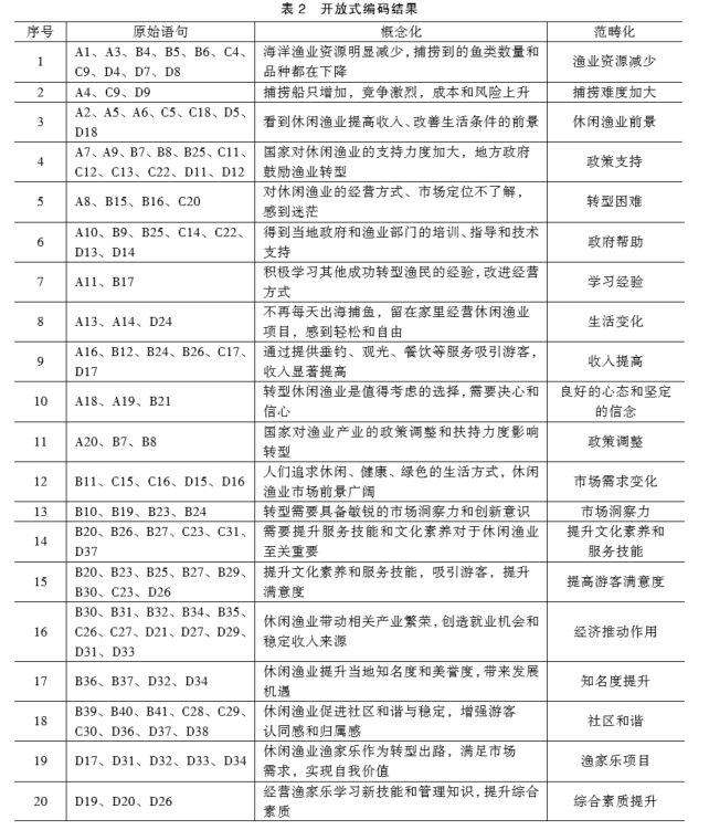 本研究主要采用半结构化访谈法收集资料,以部分参考文献加以内容补充,围绕转产休闲渔业话题,探讨影响传统渔民转产休闲渔业的因素;与樟州村4位休闲渔业经营者进行一对一深入访谈,对访谈内容进行整理、核对与检查,确保内容准确无误;采用ROST-CM6分析工具,对访谈文本词频进行统计分析,提炼和归纳出具有重要意义的50个高频词。运用扎根理论的三级编码方法,选取2/3的文本数据进行编码分析与模型构建,剩余的1/3数据用于理论饱和度检验。对获得的访谈文本数据进行以下处理:(1)开放式编码,提取影响传统渔民转产休闲渔业因素的20个概念化范畴键;(2)主轴式编码,结合文本词频分析结果进行补充完善,共获取转型背景的4个范畴、转型条件的3个范畴、转型过程的6个范畴、转型结果的5个范畴、个人发展的3个范畴、休闲渔业特色的1个范畴;(3)选择式编码及理论构建,明确“传统渔民转产休闲渔业的动因、过程与影响”核心类别,邀请专家对感知评价体系进行修正与补充,将渔民转产休闲渔业的动因、过程、成效、条件及休闲渔业项目的价值与影响等各个方面整合在一起,形成全面而深入的理论框架,如图1。编码结束后,为确认理论是否饱和,本文对已形成的理论机制进行饱和度检验,添加新的资料文本进行编码,若编码结果与原编码内容一致则通过检验,若不一致则继续添加文本资料进行编码分析,循环此过程,当不再出现新的内容时,代表此理论通过检验,编码过程结束,建立实质理论。具体编码过程,如图2。