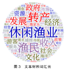 可以看出,“休闲渔业”一词占据最大空间,契合本研究的主体领域。“渔民”和“转产”为第二热点词,表明此文本以研究传统渔民转产休闲渔业影响因素为主。“发展”是第三热点词,呼应了研究主题。此外,政府、经济、收入、社会、服务、资源、市场、文化、游客、政策、捕鱼、渔家乐、经营、学习交流、垂钓等词汇也是访谈中提及较多的热点词汇,反映了促使传统渔民转产休闲渔业的一些因素以及休闲渔业渔家乐在经营过程中的一些现有项目,是区别于其他行业领域研究的重要标志。