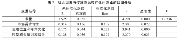 回归结果显示,市场需求增加对传统渔民转产休闲渔业的标准化系数β为0.137,t值为2.303,显著性为0.022(p值小于0.05);地理位置和海洋文化对传统渔民转产休闲渔业的标准化系数β为0.223,t值为3.941,显著性为0.000(p值小于0.05);转型相关培训和指导对传统渔民转产休闲渔业的标准化系数β为0.127,t值为2.279,显著性为0.023(p值小于0.05);F值为12.336,如表7,表明社会因素与传统渔民转产休闲渔业呈显著线性正向关系。因此,社会因素对渔民转产休闲渔业具有显著影响。