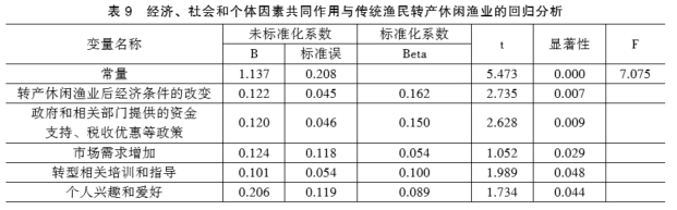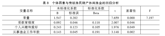 回归结果显示,受教育程度对传统渔民转产休闲渔业的标准化系数β为0.118,t值为2.007,显著性为0.046(p值小于0.05);个人兴趣和爱好对传统渔民转产休闲渔业的标准化系数β为0.105,t值为1.976,显著性为0.049(p值小于0.05);从事渔业工作年数对传统渔民转产休闲渔业的标准化系数β为0.191,t值为3.148,显著性为0.002(p值小于0.05);F值为7.197,如表8,表明个体因素与传统渔民转产休闲渔业呈显著线性正向关系。因此,个体因素对渔民转产休闲渔业有显著影响。