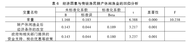 回归结果显示,转产休闲渔业后经济条件的改变对传统渔民转产休闲渔业的标准化系数β为0.189,t值为3.217,显著性为0.001(p值小于0.05);政府和相关部门提供的资金支持、税收优惠等政策对传统渔民转产休闲渔业的标准化系数β为0.180,t值为3.237,显著性为0.001(p值小于0.05);F值为10.238(表6),表明经济因素与传统渔民转产休闲渔业呈显著线性正向关系。因此,经济因素对渔民转产休闲渔业具有显著影响。
