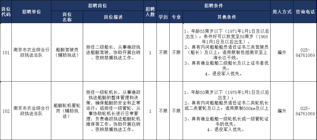 详见附件:《南京市农业综合行政执法总队2026年编外工作人员公开招聘岗位信息表》