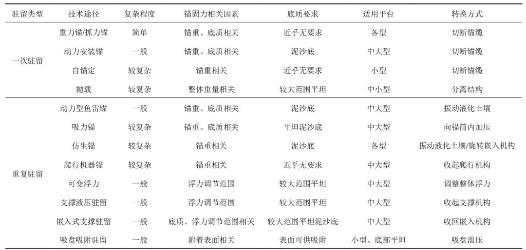 动力型鱼雷锚、吸力锚、仿生锚几类有缆驻留的锚体均会贯入海床下一定深度,与同样贯入海床的一次主流技术相比,上述几种技术可以通过振动或向海床内泵入海水等方式破坏锚固状态,减小与海床的摩擦力使锚体能够拔出并回收。这几种技术共同的优点也是可以利用海床摩擦力加大整体锚固能力的同时,还可回收锚体使其能够再次使用。也正因为其工作原理,对任务区域的海底环境有一定要求,在泥沙底有较好适应性,但难以工作在其他底质的海区。机器锚相对其他几类技术环境适应性更好,可工作在不同底质环境里,且着陆后还可以在一定范围内移动,但长期驻留后容易被掩埋,且没有脱困的手段。