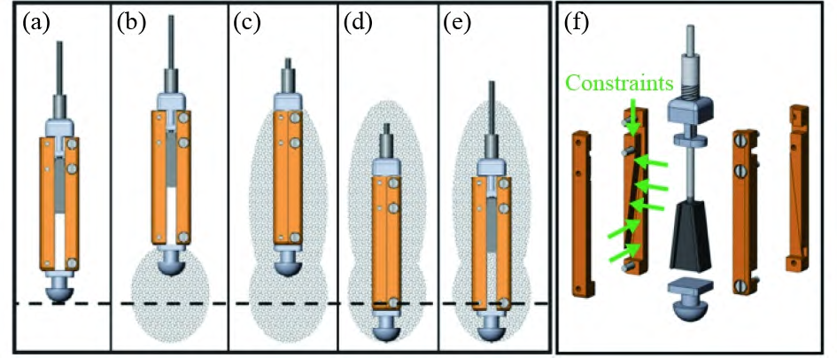 仿生锚也是重复驻留技术中的一种重要技术路线,其中RoboClam是一种极具代表性的技术,由麻省理工大学模仿大西洋剃刀蛤在海床挖掘方式设计的一种仿生挖掘机器人。Winter等对大西洋剃刀蛤的运动可以局部液化周围土壤的现象进行研究。当其收缩蛤壳时,会降低蛤壳和周围土壤之间的应力水平。在某个应力水平下,水平和垂直应力之间的不平衡会导致大西洋剃刀蛤附近的土壤失效。持续的蛤壳收缩会将土壤孔隙中的水吸入大西洋剃刀蛤,孔隙水与失效的土壤混合,形成局部流化区域。其团队结合大西洋剃刀蛤的挖掘方式、壳的收缩时间、挖掘性能和土壤局部液化的机制进行研究,并设计了气动活塞驱动末端执行器的RoboClam样机。通过实验证明了局部液化贯入的方法能够显著降低在海底嵌入刚性物体的能量消耗。RoboClam湿端体积较小,且可以用较少的能耗贯入到指定深度。但其使用气动末端执行器配套的气源等装置体积较大,气动装置在水下使用时也有一定限制,且与电驱末端执行器相比,也存在迟滞大、响应速度慢的缺点。图5(a)~图5(e)为RoboClam挖掘时末端执行器的运动,虚线表示深度基准。阴影区域显示预期的局部流化区域;图5(f)为末端执行器的爆炸视图。