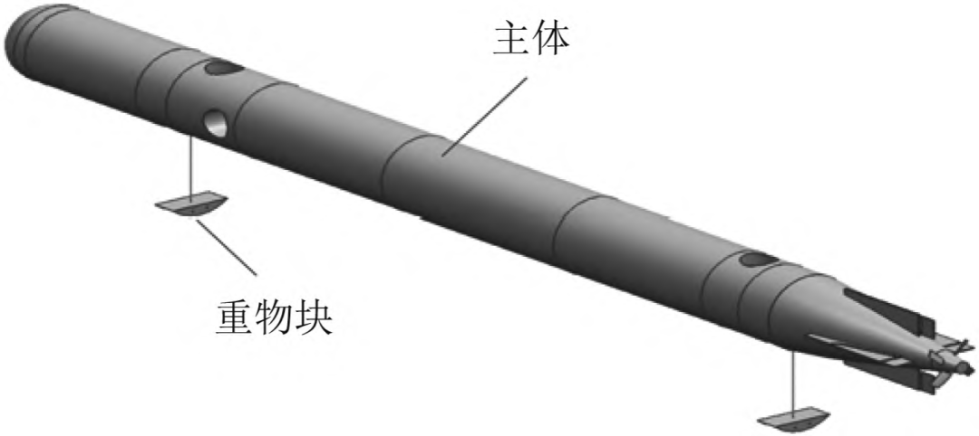 无人潜航器使用重力锚或抓力锚通过锚链将自身停驻在海底是一种早期构想。该方法受锚雷启发,将回转体水下航行器整体设计为负浮力,释放携带在无人潜航器头尾2段的重物及锚链后无人潜航器主体转变为正浮力,在正浮力的作用下不触底,并可通过控制系统与垂推调整锚链长度与浮力,实现姿态控制。“驻留—航行”转换时,由锚链释放机构解除重力锚对航行器的定位束缚(见图2)。