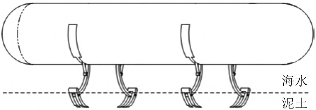 徐健等发明了一种海底驻留的锚泊装置及方法,该装置由液压驱动臂、可收放锚杆和抓泥铲组成(见图9)。在航行过程中,抓泥铲等组件可贴合在航行体表面,不破坏航行体整体流线外形。在需要驻留时,由液压驱动臂驱动锚杆,使抓泥铲嵌入海床,实现驻留。驻留—航行转换时,收缩液压驱动臂,使抓泥铲从海床拔出,实现向自由航行状态转换。该嵌入式锚泊方式解决了液压支撑式和锚链式驻留会使UUV受到海流干扰漂离坐底位置的问题。