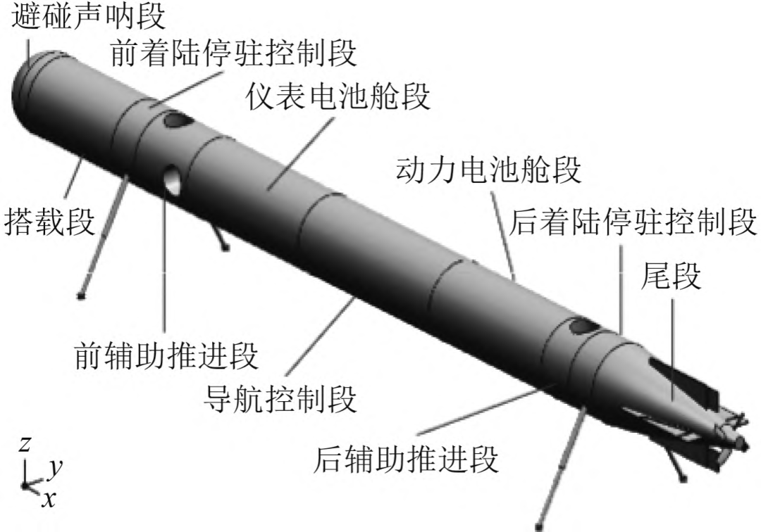 为克服整体着陆的浮力调节无人潜航器长期驻留后易被海底泥沙掩埋的问题,其技术演进为采用支撑机构的新型海床驻留形式。宋保维等提出了一种液压支撑式海底驻留的方法,即在AUV的前后分别设置一个液压支撑段,每个液压支撑段可在海底驻留时通过液压机构释放出2个支撑杆。AUV首先在预定作业地点通过声呐寻找较为平坦的区域,在该区域航行到距离海底5m左右高度,通过垂直推进器辅助实现悬停,并伸出液压腿。随后压载水舱进水,使航行器负浮力增大实现着陆。在任务结束后,重新调整航行器为悬浮状态,在该状态下收回支撑杆后,可执行后续任务。液压支撑杆驻留航行器组成见图8。