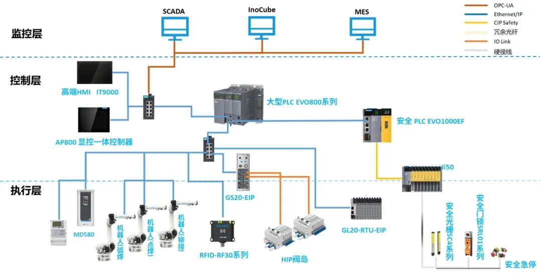 InoCar提供完整解决方案,依托汇川 IT/OT 一体化架构,覆盖整车制造与零部件生产全场景,整合控制、驱动、安全、网络等能力,内置标准化程序框架、功能块与 HMI 模板,打通从设备层到管理层的数据链路,一站式满足柔性生产、焊接、输送、车型识别等核心工艺需求。