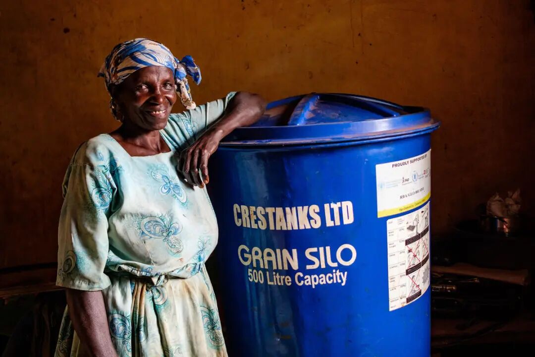 乌干达阿帕克地区,一位农民收到三机构合作分发的粮仓后改善了粮食储存条件、减少收获后损失并增加了收入。©粮农组织