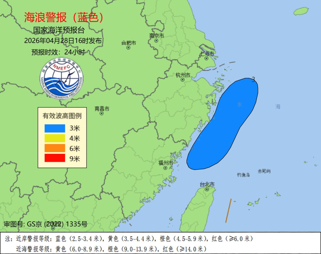 国家海洋预报台根据《海洋灾害应急预案》,今天(4月28日)下午发布海浪蓝色警报。
