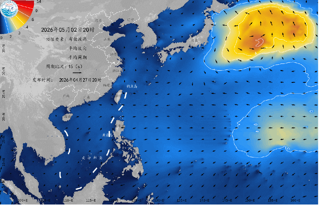 受东海低压和冷空气的共同影响,预计4月29日上午到下午,东海南部将出现2.5到3.8米的大浪区;浙江近岸海域将出现1.8到2.8米的中浪到大浪,近岸海域海浪预警级别为蓝色。