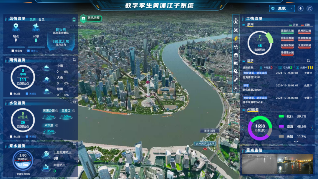 项目覆盖黄浦江干流及重要支流全线,聚焦防汛防台核心业务,构建了“数据—模型—业务—指挥”一体化的智慧防汛体系。依托全市“一张图”时空底座,融合BIM、CIM、倾斜摄影及水下多波束等多源数据,打造超大城市级高精度数字孪生底板。
