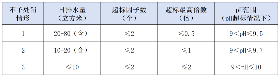新增水质轻微超标不罚事项的总体思路是:对于“两年内首次被发现”并“及时改正”的排水户,日排水量越大的,可能造成的危害后果就越大,其容错空间越小;反之,日排水量越小的排水户,可能造成的危害后果也越小,其容错空间就越大。具体不予处罚规则如下表: