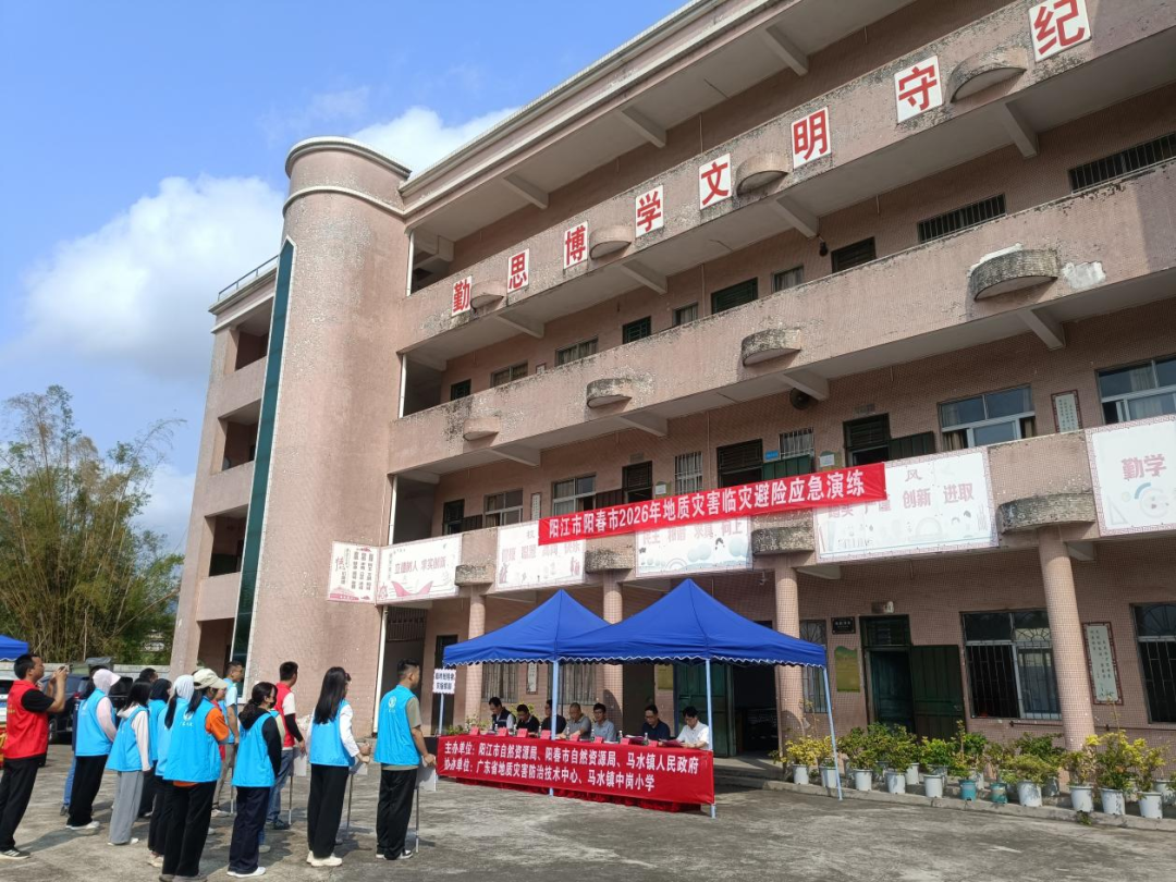 2026年3月26日上午,阳江市阳春市2026年地质灾害临灾避险应急演练在马水镇中岗小学成功举办。本次演练由阳江市自然资源局、阳春市自然资源局、阳春市教育局、马水镇人民政府、广东省地质灾害防治技术中心联合主办,严格按照广东省自然资源厅地质灾害防治工作部署要求开展,约150人参加活动。