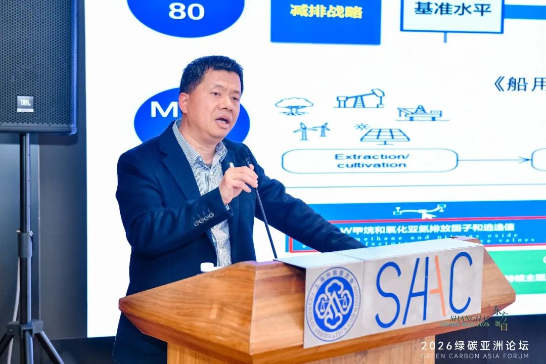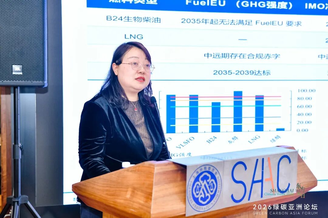 中国船级社上海规范研究所法规与绿色技术研究部主任简炎钧发表了“船用替代燃料技术迭代与供应破局路径展望”的专题演讲。他在演讲中提到,国际航运业向低碳转型已是全行业共识,目前行业主要通过燃料能源转型,搭配节能技术和船舶碳捕捉技术实现减排,而建立全球统一的减排检查规则与绿色认证体系,是破解当前绿色燃料发展难题的核心关键。国际海事组织已明确航运业未来逐步实现温室气体净零排放的目标,配套的燃料碳排放计算标准、船舶减排要求等规则也在陆续出台。虽然全球航运净零排放的公约修订暂时推迟,但相关的落地准备工作一直在推进,行业转型的整体趋势不会改变。他分析了目前主流的四种绿色燃料:液化天然气是当前技术最成熟的清洁过渡燃料,未来可通过升级燃料来源和搭配碳捕捉技术延长使用周期;生物燃油不用改造现有船舶发动机,是老旧船舶短期减排的最佳选择,但只能作为过渡性燃料;甲醇是中长期发展潜力最大的绿色燃料,目前受成本、产能和认证标准不完善的限制;氨燃料生产工艺最简单,是远期实现深度脱碳的重要选项,但安全和配套产业链还不成熟。他强调,未来不会出现单一燃料主导市场的情况,各地会依托自身资源优势形成不同的燃料发展路线。统一的全球规则将释放稳定的市场需求,反过来推动技术进步和供应链完善。中国船级社上海规范研究所法规与绿色技术研究部主任简炎钧上海国际航运研究中心秘书长张婕姝发表了“全球绿色甲醇供需格局展望与上海机遇”的专题演讲。她在演讲中提到,全球航运减排的硬性要求催生了绿色甲醇的刚性市场需求,不管是国际还是国内,都呈现出一种规划很热,但是投产比较冷的特征,上海正迎来打造全球绿色燃料加注与交易双中心的历史性机遇。她表示,绿色甲醇是少数能满足未来长期减排要求的船用燃料,已成为航运业中长期的核心替代选择。国内也形成了全方位的政策支持体系,今年政府工作报告首次提及绿色燃料,相关项目还能获得中央财政资金扶持。全球范围内,绿色甲醇的规划产能规模庞大,但真正投产的比例很低,未来几年会迎来产能集中释放期。目前全球具备绿色甲醇加注能力的港口不多,中国占了近一半,上海港的加注业务量在国内遥遥领先。需求主要由全球头部航运企业主导,未来几年船用绿色甲醇的供应缺口将持续存在。她强调,国家明确支持上海建设全球绿色燃料加注与交易双中心并设定了清晰的发展目标。上海已打通本地从原料处理到终端加注的完整产业链,建立了跨区域供应通道,配套设施完善,还在行业标准、金融服务和核心技术领域形成了独特优势。她最后提出了五条关键实施路径:放开市场准入引入竞争,吸引全球龙头企业落户;加快建设外高桥加注锚地,扩建洋山港码头和储罐,匹配未来大规模加注需求;组建采购联盟,通过投资或长期合同提前锁定国内外优质产能;争取退税、港口费减免等优惠,推动生物燃料混兑政策落地;加快推出绿色甲醇期货,打造有国际影响力的交易中心。上海国际航运研究中心秘书长张婕姝