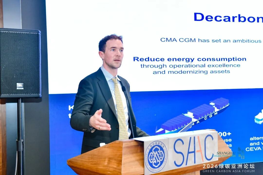 达飞中国战略业务发展总监潇如风D'AZEVEDO Florent发表了“迈向低碳航运:达飞集团的脱碳转型之路”的专题演讲。他在演讲中提到,法国达飞海运集团作为全球第三大集装箱航运企业与综合物流服务商,正以清晰路径推进全链条脱碳,助力全球航运绿色转型。他介绍,法国达飞海运集团1978年在法国成立,1992年进入中国市场,业务覆盖海运、陆运、空运、港口运营与仓储物流等全链条服务。集团设定了到2050年实现全业务净零碳排放的目标,与国际海事组织相关路线图保持一致。他表示,达飞集团脱碳战略围绕两大核心:一是通过优化船舶设计、运用数据与智能技术降低能源消耗,推进船舶节能改造与岸电使用;二是持续提升绿色能源在能源结构中的占比,积极应用液化天然气、生物甲醇、生物柴油等低碳与零碳燃料。今年3月,达飞在上海洋山港完成中国规模较大的单次生物甲醇加注作业,与中国企业合作推进绿色燃料应用。同时,集团通过低碳物流方案、替代燃料车队、可再生能源仓库等举措降低陆域排放,并设立专项能源基金,投资氢能、生物燃料、电动运输等创新技术,探索风能辅助推进等低碳船舶应用。他认为,全球航运脱碳需要统一规则、稳定供应链与多方协同。达飞愿继续深化在华合作,携手行业伙伴推动绿色燃料普及与技术创新,为上海国际航运中心绿色发展与全球航运生态可持续转型贡献力量。达飞中国战略业务发展总监潇如风D'AZEVEDO Florent