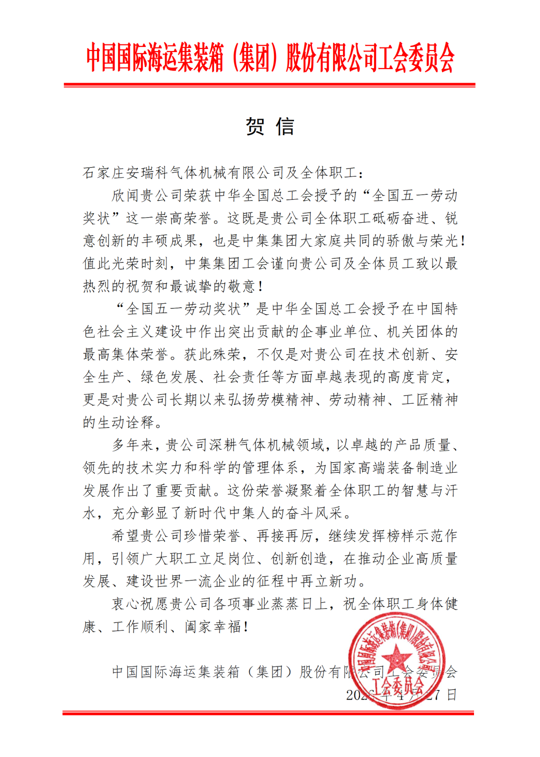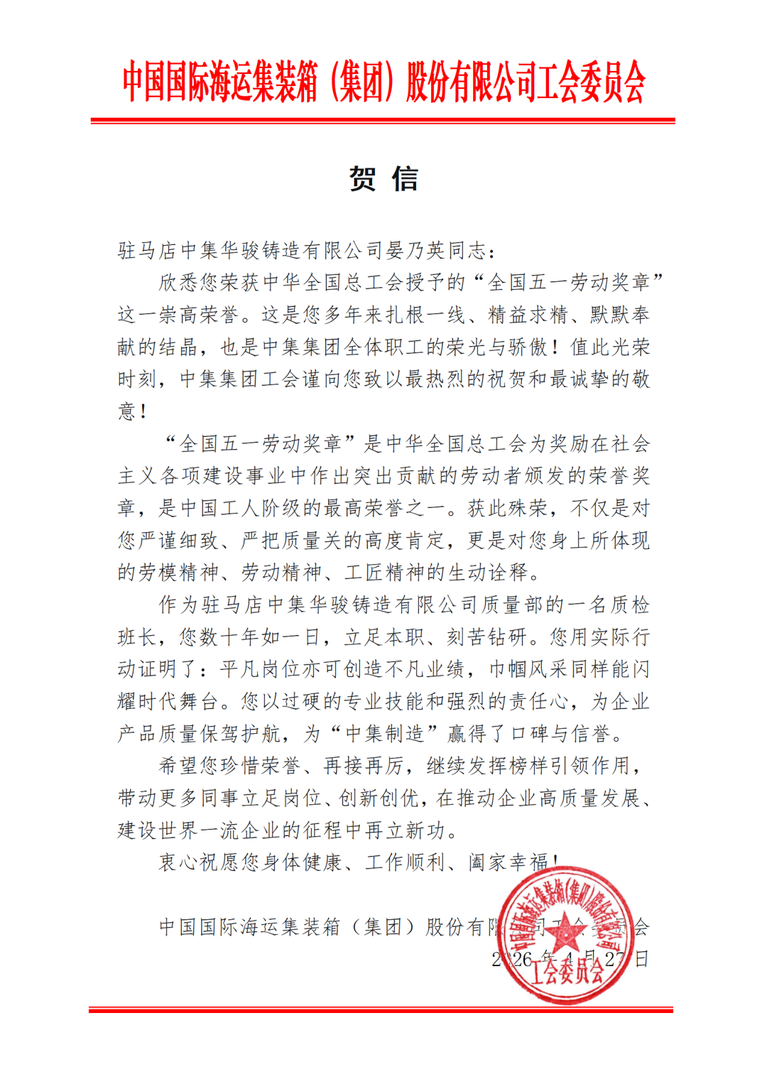 4月28日,中集集团工会第一时间分别向气体机械及晏乃英同志发出贺信,向获奖者致以热烈祝贺和诚挚敬意。