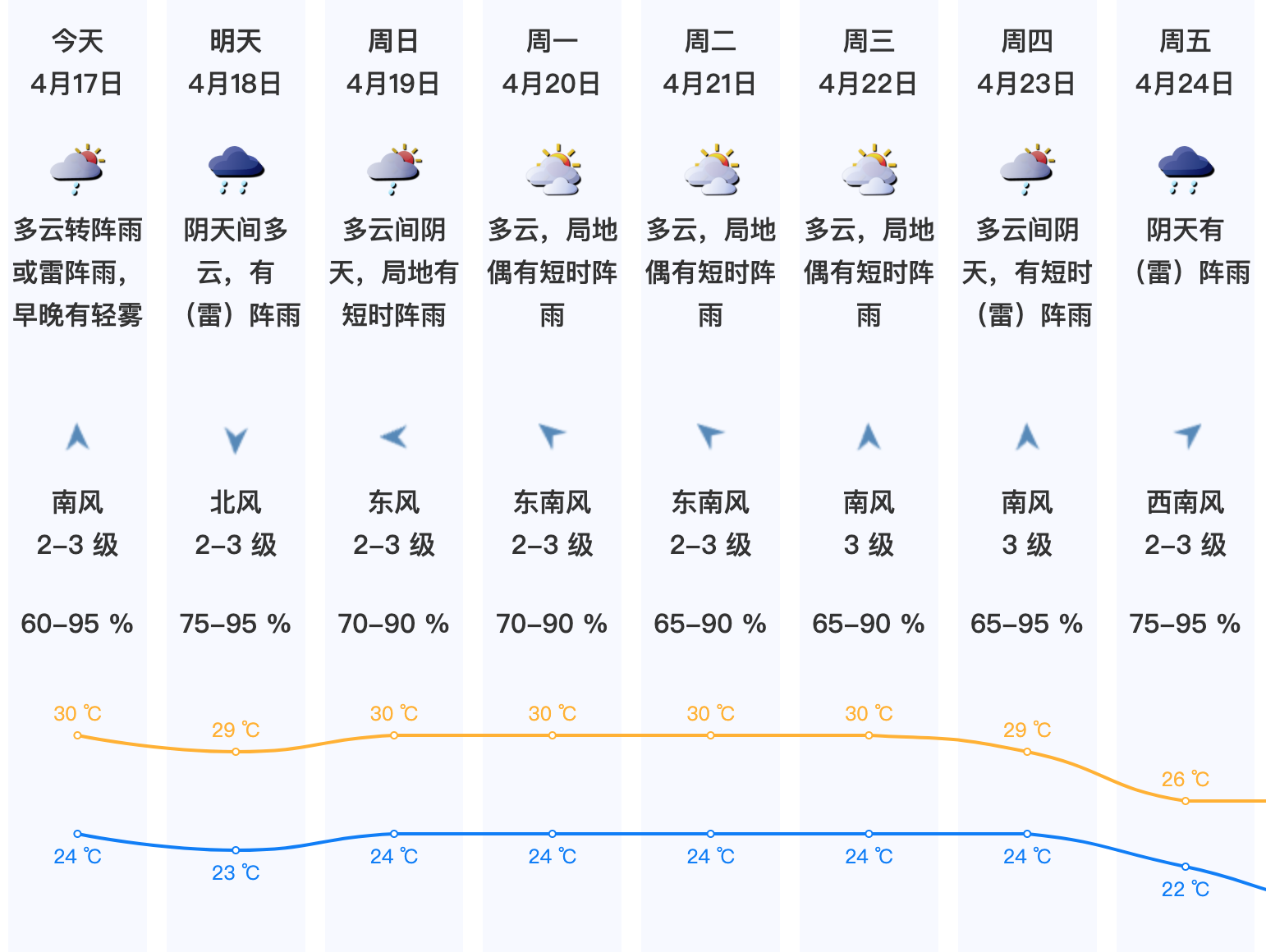 预计深圳市17-18日多云到阴天,早晚有轻雾或雾,有(雷)阵雨,部分时间局地雨势较大,气温24-30℃。