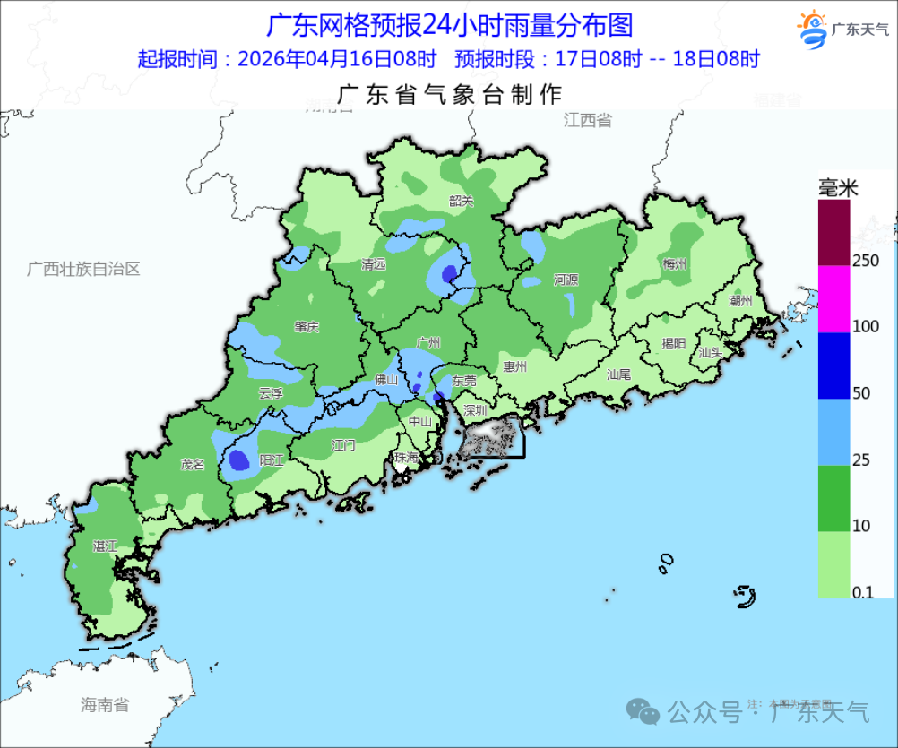 预计,17日白天到夜间,韶关南部、清远南部、河源北部、珠三角大部和粤西市县阴天有中到大雨局部暴雨,其余市县有雷阵雨局部大雨,上述地区雷雨时局地伴有8级左右的短时大风。18-19日,降水明显减弱,全省大部雷阵雨转多云。另外,未来3天,早晚部分市县有(轻)雾。