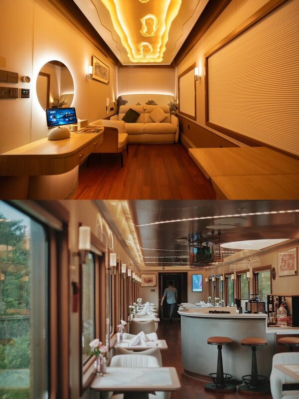 "星光•澜湄号"由国内外顶尖团队设计改造,融合自然元素与现代美学,采用欧盟级环保材料打造舒适空间。列车搭载国内首套综合智能信息系统,30间独立豪华客房配备超大观景窗,全舱智能客控让科技感与舒适度拉满。
