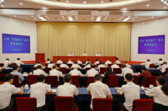 11日上午,全省“信用浙江”建设部署推进会在杭州召开。记者 陆乐 摄11日上午,全省“信用浙江”建设部署推进会在杭州召开。省委副书记、省长刘捷在会上强调,要深入学习贯彻习近平总书记关于社会信用体系建设的重要论述精神,全面贯彻落实党中央、国务院决策部署,迭代完善“531X”体系架构,构建覆盖各类信用主体、制度规则统一、共建共享共用的社会信用体系,推动社会信用体系与经济社会发展各方面深度融合,加快建