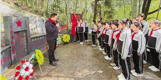 4月1日,丽水碧湖小学的少先队员来到黄景之烈士墓前开展祭扫活动。 通讯员 林雅妮 摄雨落风起,又是一年清明。连日来,在浙江各地,人们怀着崇敬与追思走进英烈安息之所,以多种形式缅怀为国家和人民英勇献身的英雄。3月30日,舟山的朱枫烈士被捕处革命遗址前,武警浙江总队舟山支队数十名官兵通过默哀、献花、聆听英雄事迹、重温入党誓词等形式,向英勇无畏的隐蔽战线英雄致以崇高敬意。76年前,朱枫因执行秘密情报任务