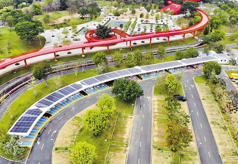 虹桥公园超充站。 受访单位供图深圳新闻网2026年4月14日讯(深圳报业集团记者 柯季 陈馥玉 通讯员 徐成龙 胡美施)近日,粤港澳大湾区规模最大的车网互动超充示范站——深圳光明虹桥公园超充站(下简称“虹桥公园超充站”)一期正式投入运营。该站依山就势而建,紧邻公园标志性的红色栈道,配备了23台V2G(车网互动)充电桩,覆盖37个车位,成为绿色能源与城市公共景观融合的新地标。提供多层次补能体系虹桥公